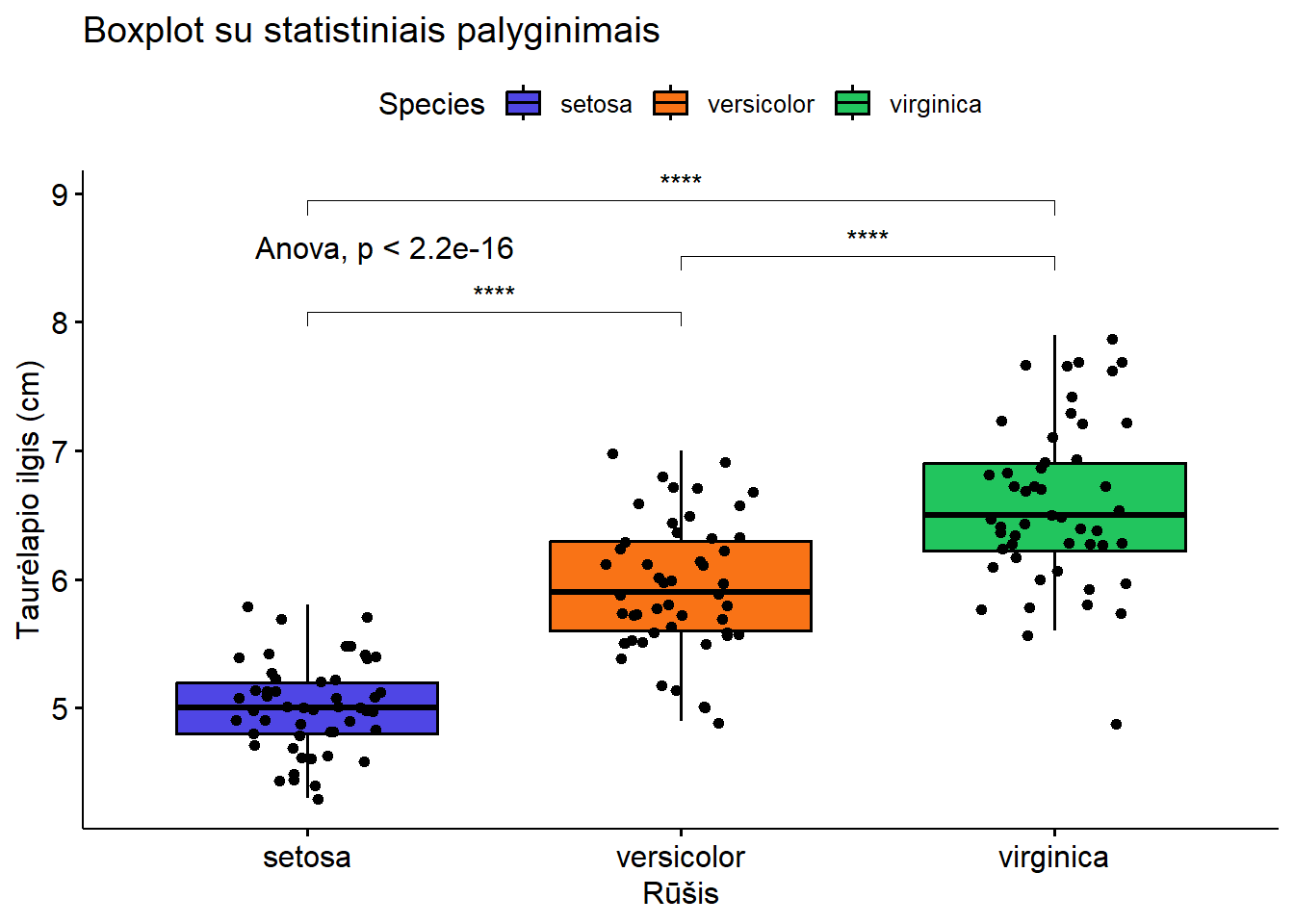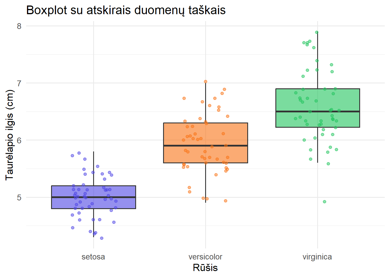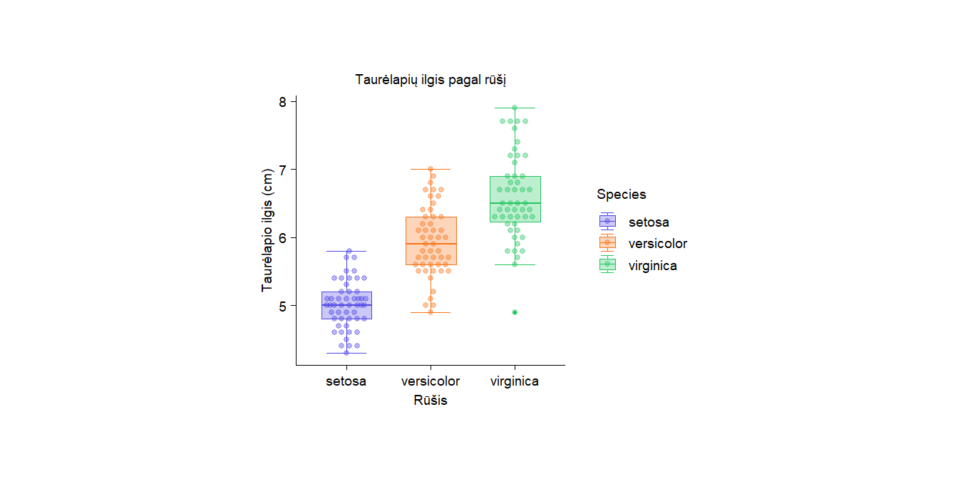 boxplot(), jei norite greitai peržiūrėti duomenis. - Publikacijoms – naudokite ggplot2 arba tidyplots, jei norite pilnai kontroliuoti grafiko išvaizdą.